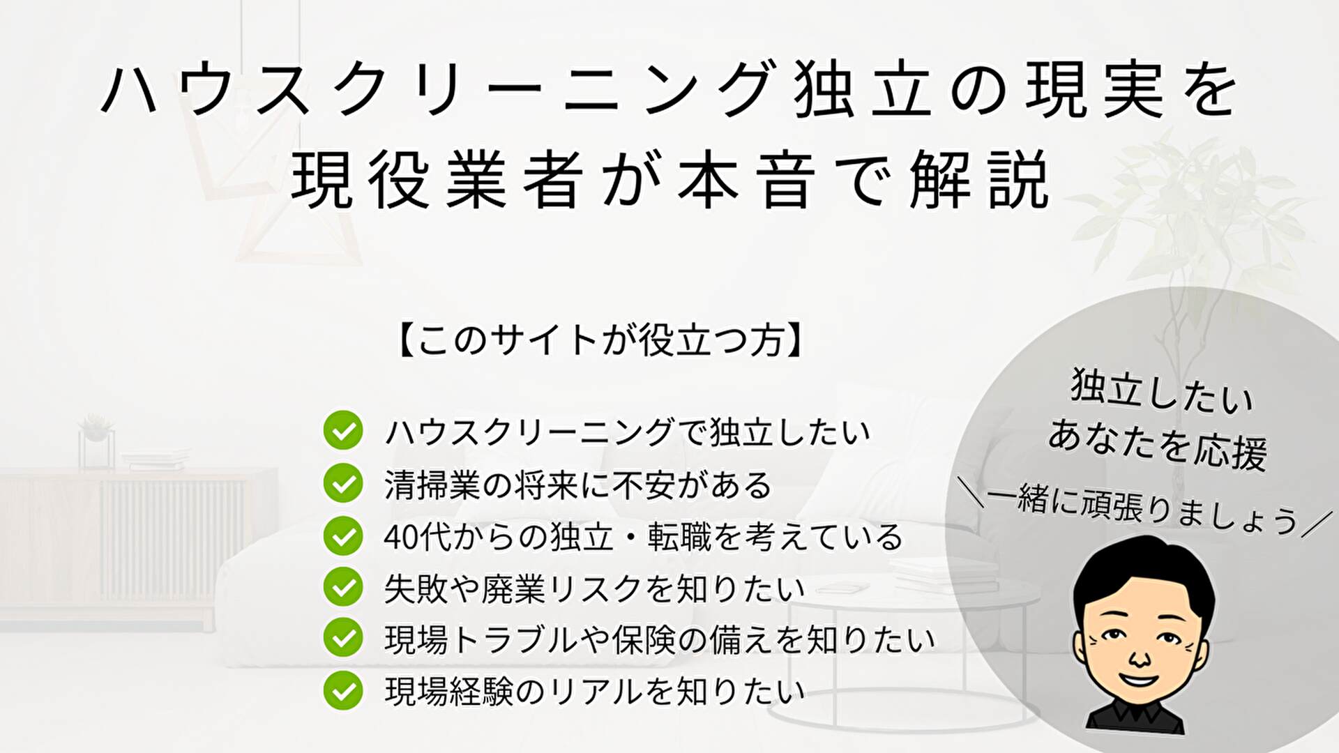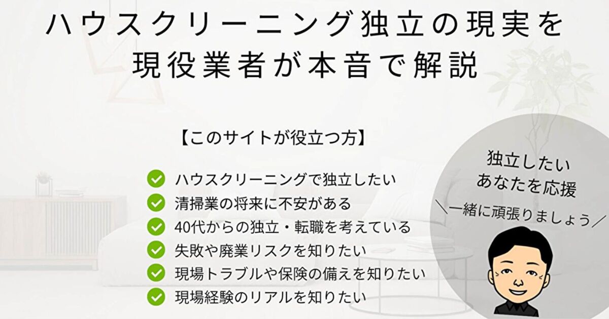 このサイトでは、ハウスクリーニング独立の現実、集客方法、現場トラブルの対処法などを、実体験をもとに分かりやすくお伝えしています。